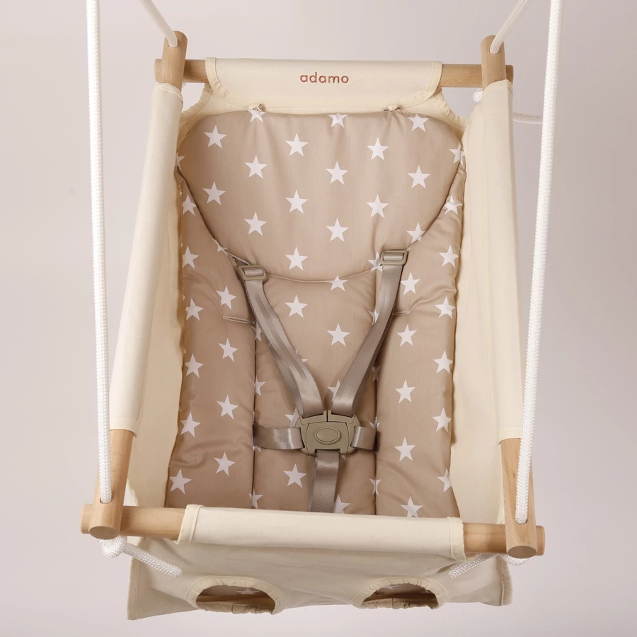 Az Adamo hinta, a rég elfeledett bölcső és az egy ponton függesztett hinta ötvözete. Újszülött kortól, egészen a baba 3 éves koráig tudjátok használni! Egy ponton, egy rugóval ellátott kötélzeten függeszkedik, így minden irányú mozgást tud produkálni. Használható bölcsőhintaként, ülőhintaként, rugós hintaként. Egyszerűen megunhatatlan!