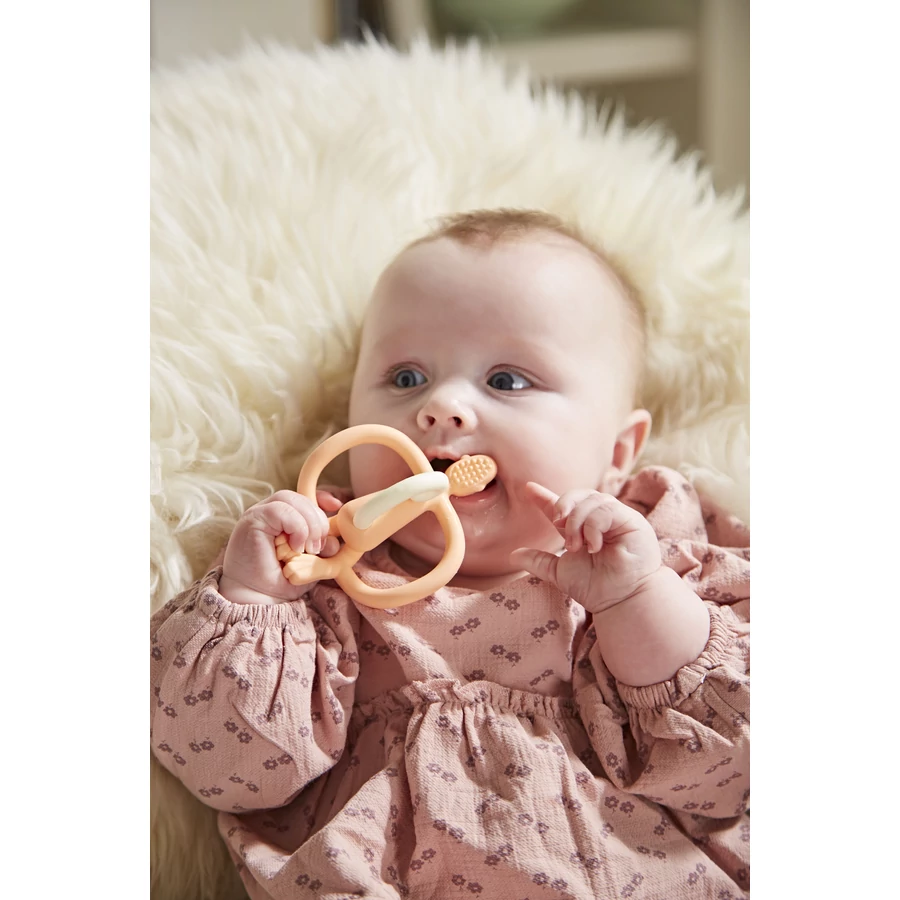 Ez az innovatív, pehelykönnyű szilikon rágóka kifejezetten úgy lett kialakítva, hogy hatékonyan enyhítse a fogzással járó kellemetlenségeket. A majom fejének hátulján elhelyezett puha dudorok finoman masszírozzák az érzékeny ínyt, miközben lehetőséget adnak a fogzást segítő termékek pontos felvitelére a nehezen elérhető hátsó őrlőfogakhoz.