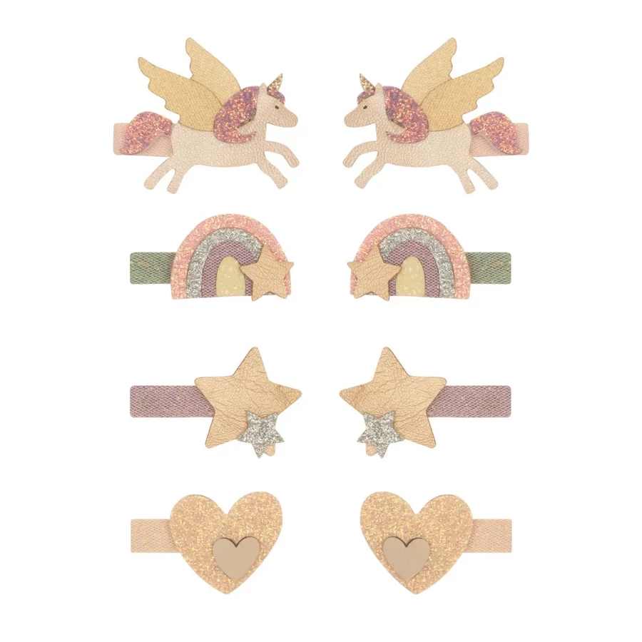 Ezek a repülő unikornis mini csatok minden kislány fantáziáját szárnyalni hagyják! Csillogó unikornisok, ragyogó szivárványok, csillámló csillagok és aranyszínű szívek díszítik ezeket a bájos kiegészítőket.